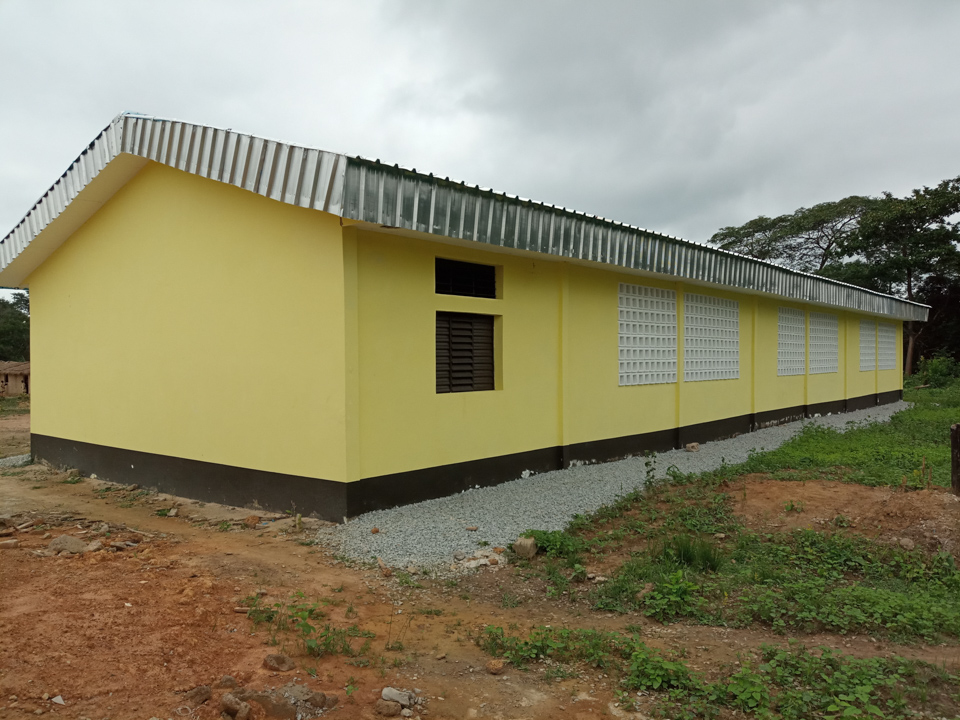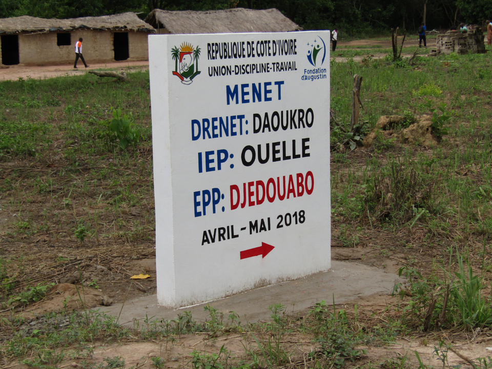 Ce projet financé intégralement par la Fondation d’Augustin dans la localité de Djédouabo, ceci, grâce à un généreux donateur, a consisté en la construction d’un nouveau bâtiment de 3 classes, un bureau de directeur, un magasin et des latrines, en remplacement des structures en matériaux précaires faisant office d’école pour les élèves. Des démarches sont en cours pour lever les fonds nécessaires à la construction d’un deuxième bâtiment de 3 classes afin de compléter l’école.